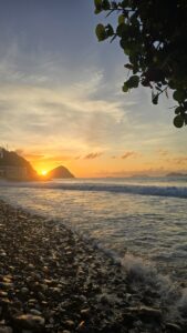 Der erste Sonnenuntergang an unserem Resort mit direktem Strandzugang war phantastisch.