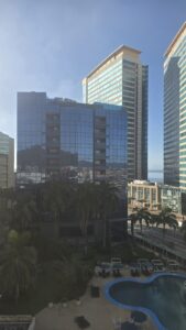 Auch unser Raum war groß und die Betten bequem. Wir nächtigten im 7. Stock. Der Ausblick auf die See war nur durch das Hyatt etwas verbaut.