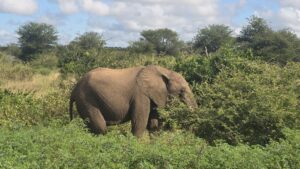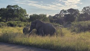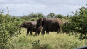 Erst auf der letzten Gravelroad zurück Richtung Crocodile Bridge Gate sahen wir viele Tiere. Zunächst Elefanten.