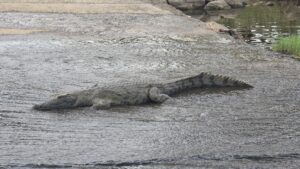 In einem Teich sahen wir weit entfernt einen Flamingo, aber vorne am Ufer ein Krokodil.