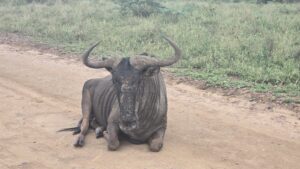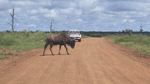 Zum Abshluss ein Wildebiest ohne Scheu auf der Straße.