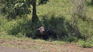 Ein junges Büffelkalb jaulte unter einem Baum am Straßenrand.