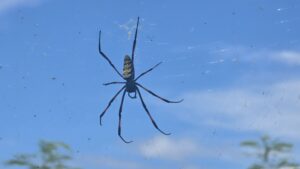 Über den Weg spannte sich auch ein Spinnennetz mit dieser Spinne. Geschickt hatte sie das Netz aber hoch genug gebaut, dass wir es darunter passierten konnten.