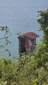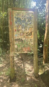 Es ging über Naturtreppen hoch. Oben nahmen wir die erste Abzweigung links, wo ein kleiner überwachsener Pfad herunter führte. Wir folgten ihm bis zu einer plötzlich auftauchenden Tür mit Warnschild und wussten, dass wir etwas falsch abgebogen waren.